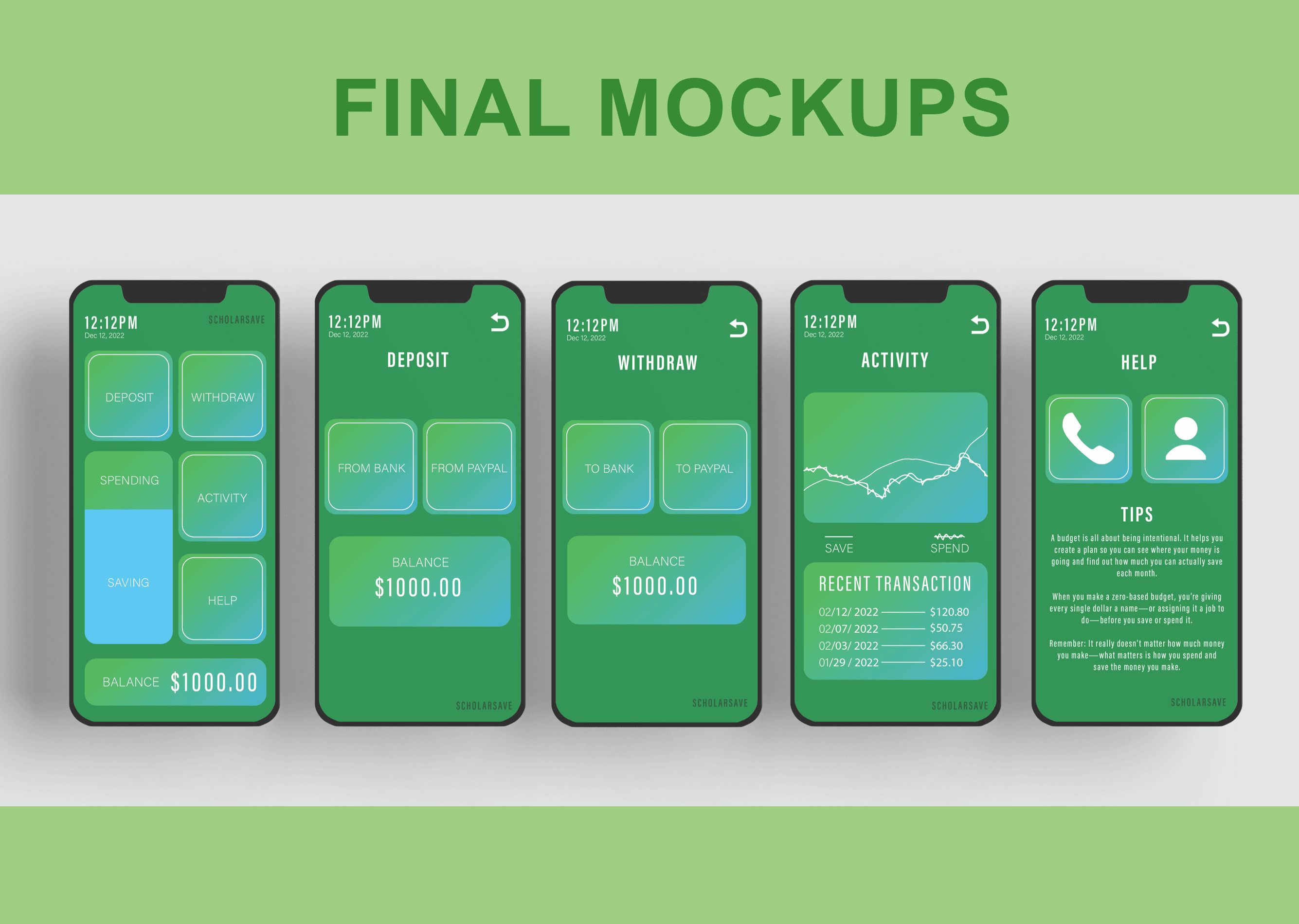 ScholarSave is a conceptual app design focused on empowering users to achieve financial wellness. It seamlessly blends intuitive user interfaces with practical tools for balancing saving and spending. Featuring personalized budgets, smart goal trackers, and dynamic spending insights, ScholarSave helps users stay on top of their finances while maintaining flexibility. The design prioritizes simplicity and accessibility, ensuring a smooth experience for users at any stage of their financial journey.